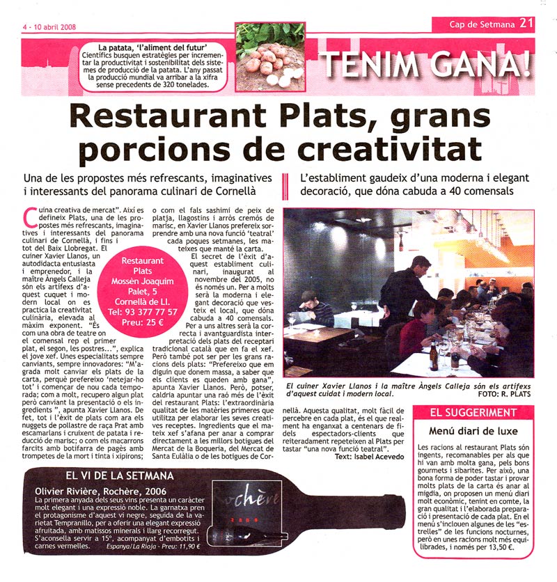 eldebat.cat (Diari digital de Catalunya) Tenim Gana! / Restaurant Plats, grans porcions de creativitat - [ 03/04/2008 ] > veure notícia > descarregar retall de premsa